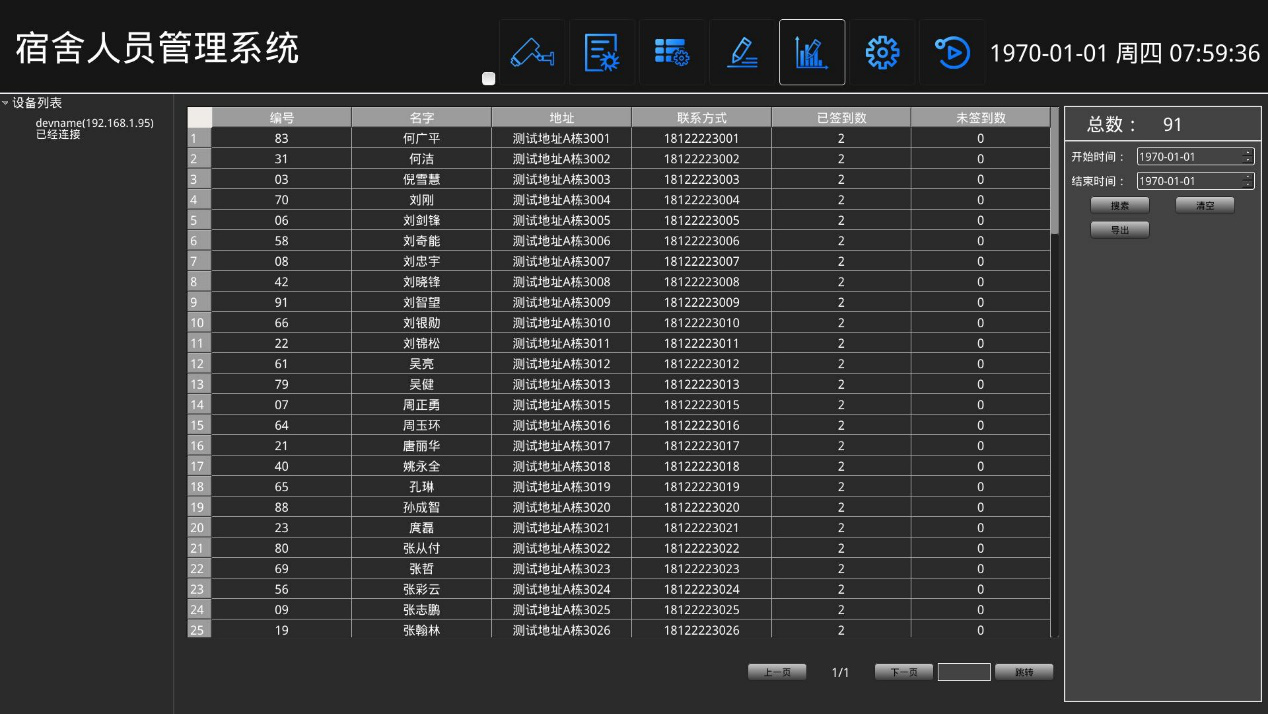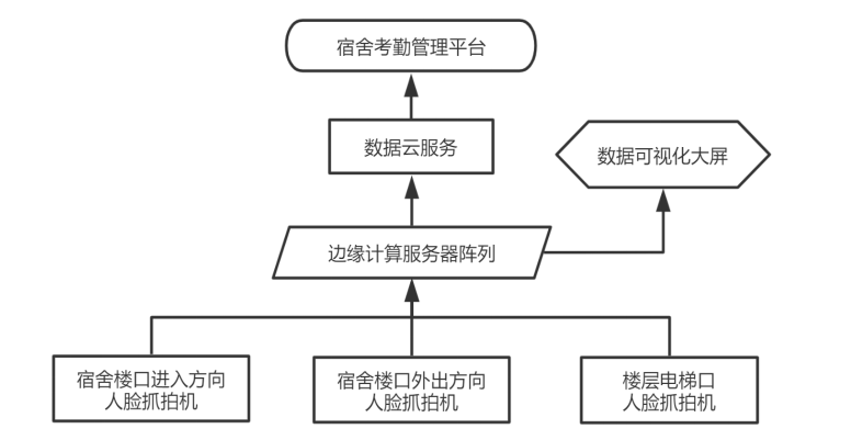 基于本校宿舍基本情況,結(jié)合學校運營管理模式,將宿舍考勤系統(tǒng)軟硬件模塊按照如下架構(gòu)圖部署。綜合樓大門處出入兩方向根據(jù)樓道寬度分別安裝2-4個人臉識別抓拍機,6-11樓層電梯口各安裝2-3個人臉識別抓拍機,抓拍機視頻圖像數(shù)據(jù)通過網(wǎng)絡路由設備實時匯總*宿管邊緣計算服務器陣列,服務器將視頻流信息中解析出的人臉數(shù)據(jù)與校方學生人臉庫信息進行實時N比N快速驗證,獲得學生身份信息,將對比結(jié)果實時顯示在數(shù)據(jù)可視化大屏上。結(jié)合學校考勤及宿舍管理邏輯,將各維度報表分析推送*云服務器,校方管理人員可通過宿舍考勤管理平臺獲取數(shù)據(jù)分析結(jié)果。